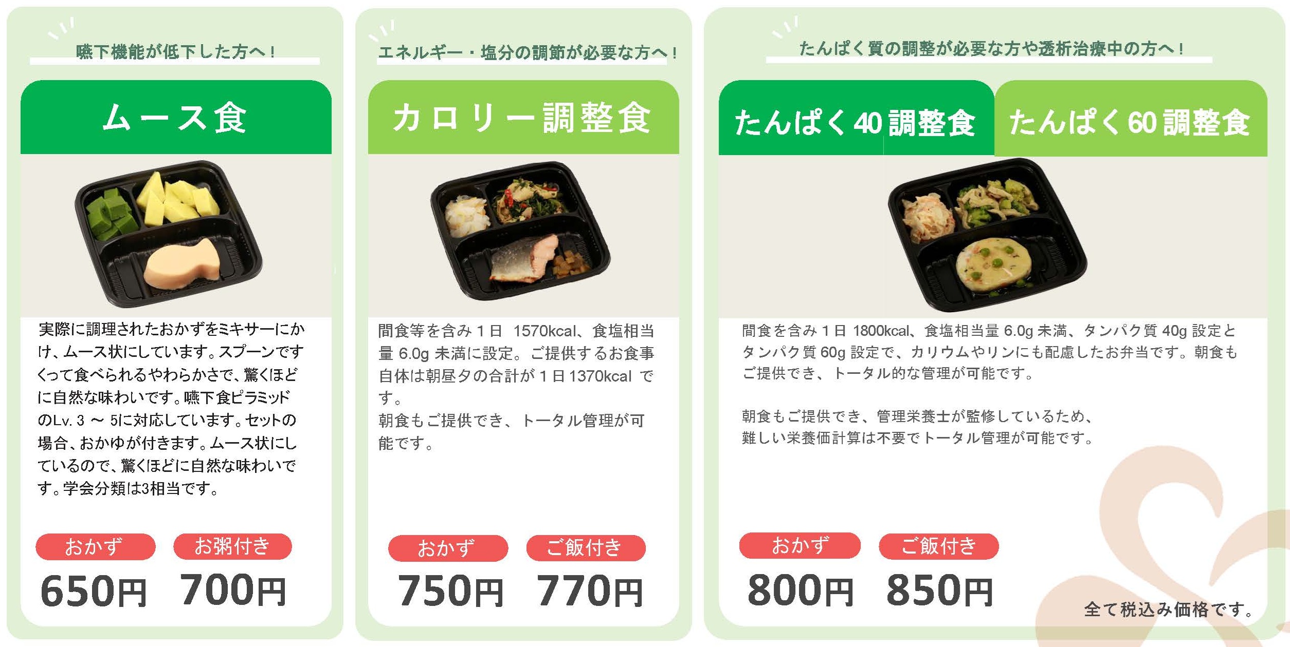 美味しさはもちろん、たんぱく制限やムース食等、お食事の制限がある方でも利用できるユニバーサルなお食事お届けします。